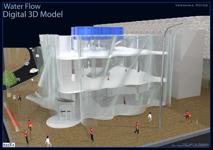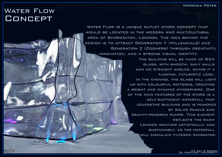 Water Flow is an innovative outlet store located in Shoreditch, London, designed to appeal to Millennials and Zoomers through bold aesthetics and sustainability. The building has a flowing, glass-heavy structure with wavy walls and a solar panel-powered rainwater waterfall that symbolises the city atmosphere. At night, the store transforms into a colourful display of light patterns, transforming the building into a work of art that combines light and water.